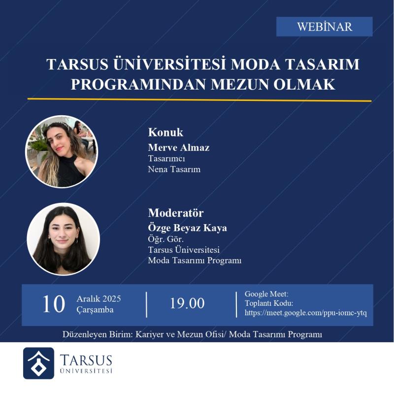 “Tarsus Üniversitesi Moda Tasarım Programından Mezun Olmak konulu düzenlenecek webinara davetlisiniz!”
